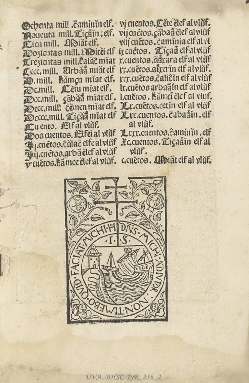 Marca de impresor granadina de Varela, en la que se lee el lema: DNS [DOMINUS] MICHI [MIHI] ADIVTOR: NON TIMEBO QVID FACIAT MICHI [MIHI] Hº [HOMO]. [«El Señor es mi ayuda, no temeré lo que me haga el hombre”]