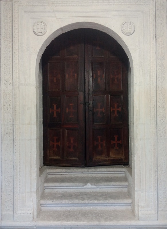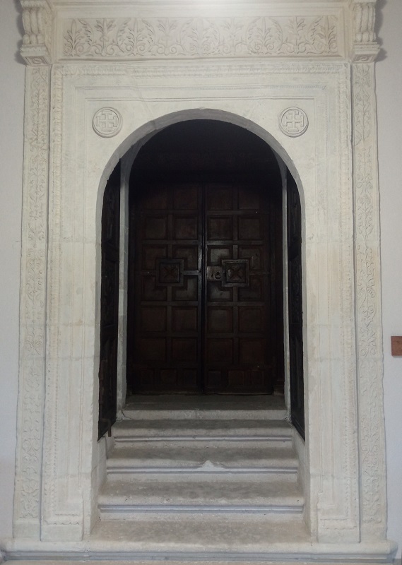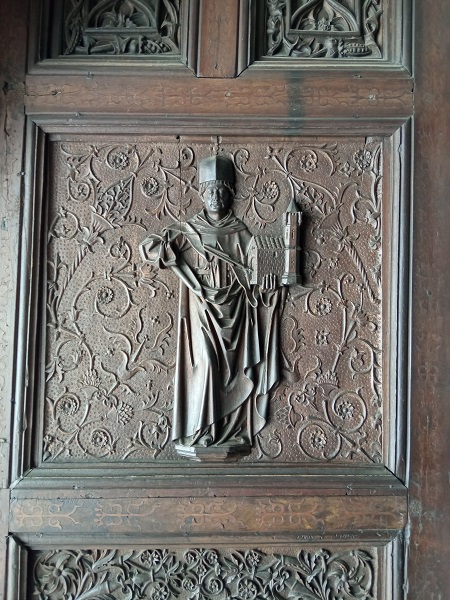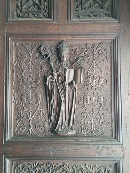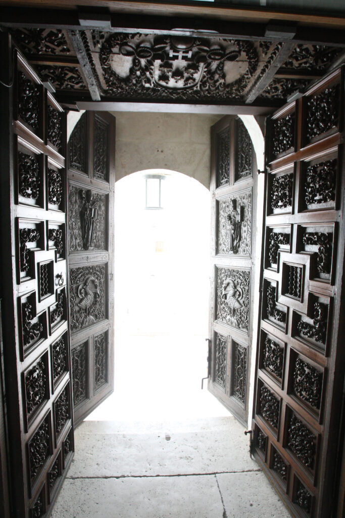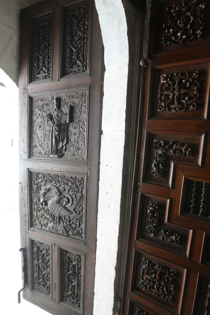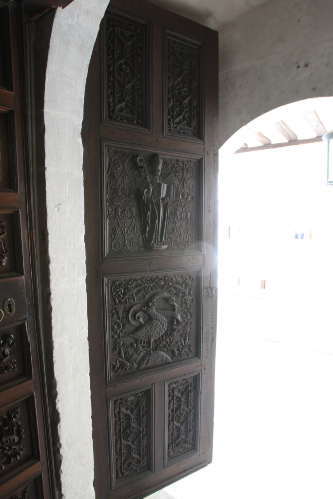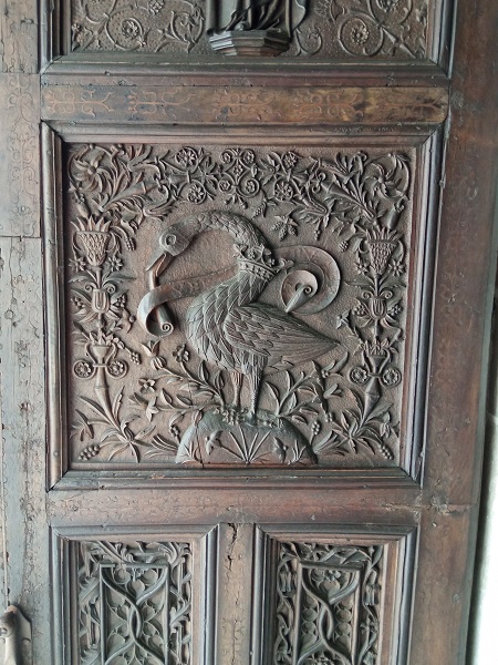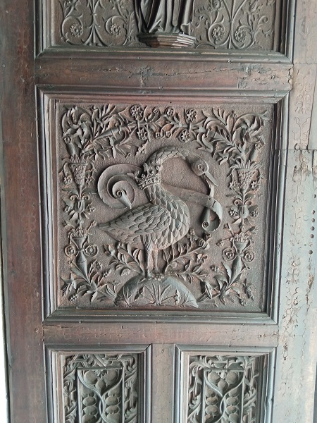 Debajo, en el panel central, de cada puerta hay dos cisnes de cuello coronado con filacterias alrededor en las que se pueden leer casi borrados por el tiempo y las muchas manos los versículos de Juan 1.1 en la Vulgata: Verbum erat / apud Deum.