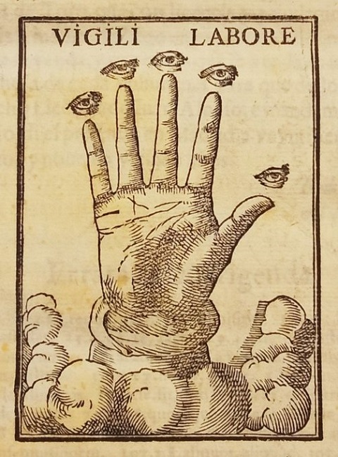 Y, si la sabiduría está junto a Dios y emana de Dios, también y no pocas veces se presenta con él y como su aliento, en forma de nube. Nubes de las que emerge una mano simbólica y activa tal y como se han reflejado también en diversas marcas de impresor de carácter emblemático a lo largo de la historia: